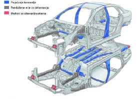Na narednim skicama, prikazana je moderna samonoseća karoserija. Znajući, da je u prethodnom slučaju, šasija nosila karoseriju vozila, ova izvedba karoserije bez šasije, nazvana je samonoseća. Ovakva karoserija, robotski se spaja od niza limenih elemenata, koji tako spojeni tvore tkzv. Box Sekcije. Naziv Box Sekcija, dobiven je poradi sličnosti zavarenih elemenata kutijama. Znači, bez obzira na debljinu lima, ovakvi kutijasti ili cjevasti oblici po rubovima karoserije, tvore vrlo kompaktnu cjelinu (karoseriju). Kako je vidljivo, i cijela karoserija ima oblik kutije sa box sekcijama po rubovima, te je kao takva vrlo otporna na torziono savijanje, što je bila mana šasije. Kod samonoseće karoserije, vodilo se računa o maksimalnoj zaštiti putnika u vozilu, prilikom eventualnog sudara ili slijetanja sa ceste. Tako na istoj skici, možemo vidjeti pojačani materijal, upotrijebljen u izradi same kabine vozila. Pri izradi ovakve karoserije, debljina materijala se mijenja od prednje i zadnje strane vozila prema sredini. To znači, da se u slučaju sudara, savijaju i drobe prednji tanji materijali, što će amortizirati udarac i sačuvati kabinu vozila sa putnicima. Upotrebom tanjih i debljih materijala pri izradi karoserije, postignuta je maksimalna sigurnost putnika u vozilu. Tako na primjer u situacijama sudara manjom ili srednjom brzinom, primjećujemo, da je motor vozila skupa sa transmisijom, završio ispod vozila, dok se kabina sa putnicima uzdigla. I kod udarca u zadnji kraj vozila, uvijek možemo vidjeti oštećeni dio vozila utisnut prema kolniku a ne prema gore. Znači, upotrebom tanjih materijala na mjestima predviđenim za deformiranje, možemo pri konstrukciji karoserije točno predvidjeti nastala oštećenje prilikom sudara. Čak što više, kod današnjih vozila, na takvim mjestima, dijelovi karoserije izrađeni su u obliku harmonike, pa pored toga što se prvi savijaju, dodatno apsorbiraju udarac. Tako, gledajući ove skice, lako možemo dobiti sliku razvijanja situacije prilikom sudara, recimo sa prednje strane. Pri udarcu u drugo vozilo, najprije se lome plastični branici na vozilu, koji su danas dosta udaljeni od same karoserije a nerijetko je međuprostor ispunjen pjenom (stiroporom). Nakon ovoga, sila udarca, prenosi se na metalni nosač branika, koji je pričvršćen na karoseriju vozila preko blokova za apsorpciju udarca. Ti blokovi, izrađeni su od gume a nerijetko od metalne harmonikaste cijevi. Tek nakon ovakve apsorpcije udarca, silu impakta, preuzeti će prednji dio karoserije. Sada dolaze do izražaja tanji pa deblji materijali karoserije, koji će redoslijedom dodatno apsorbirati udarac. Ovakvim načinom ublažavanja udarca, zacijelo će se maksimalno sačuvati prostor za putnike. Možda e ovaj dio teksta objasniti komentare laika koji slijede nakon manjeg sudara, kao: i to ti je nekakav auto, sav se raspao od udarca sa svega dvadesetak kilometara na sat. Očigledno da se prilikom izrade konstrukcije vozila moglo birati samo između sigurnosti i materijalne štete uzrokovane sudarom