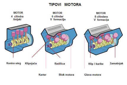 Ovakvi motori sa unutrašnjim sagorijevanjem, izrađuju se već sa jednim cilindrom i klipom (pod cilindar, podrazumijeva se čelična košuljica uprešana u blok motora a u kojoj kliže klip motora). No u automobilskoj indrustriji, najčešće srećemo motore sa 4 i 6 cilindara postavljenih linijski ili u V formaciji. Kod većih i luksuznijih vozila, naići ćemo na motore sa osam, deset i dvanaest cilindara u V formaciji. V formacija motora, pruža daleko bolji balans motora ali je znatno skuplja izrada. Naime, kako vidimo na skici, takav motor ima dvije glave a i povezivanje bregastih osovina sa radilicom, daleko je kompliciranije, nego kod linijskih motora. Upravo iz tog razloga, danas možemo često susresti vozila sa šestocilindrićnim linijskim motorima.
