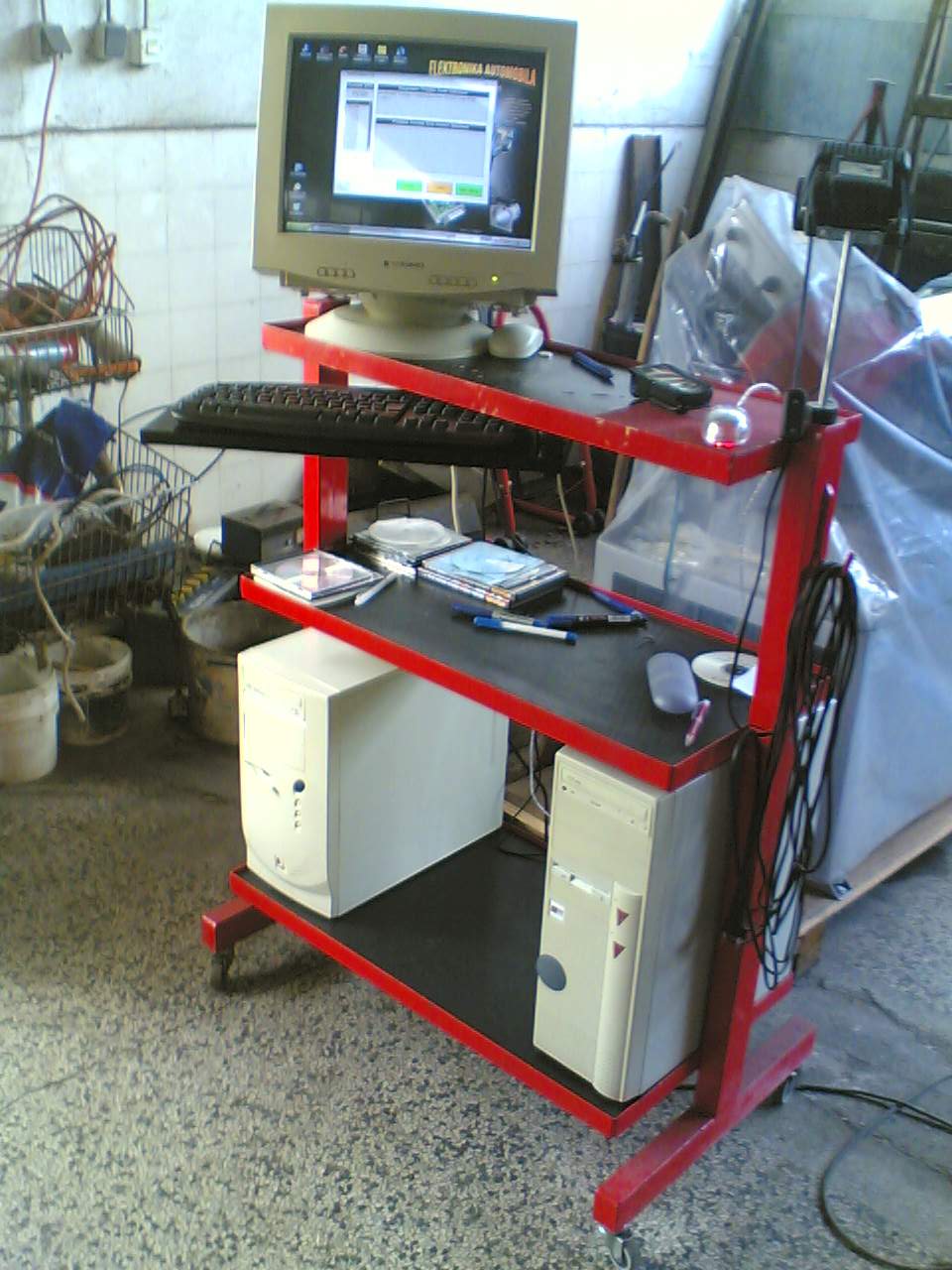 Autodijagnostika u konfiguraciji PC računala svakako je najjeftinije rješenje za radioničku upotrebu. Prikladno postavljena konfiguracija na pogodan višenamjenski trolej (kolica) koji se povoljno mogu naći po trgovinama, omogućiti će mobilnost uređaja po cijelom prostoru. Nadalje, pored autodijagnostike u PC se instalira i Autodata kao i E-rječnik te pokoji dodatni program za autodijagnostiku, pa će to svakako biti jedno sretno rješenje gdje čovjek ima sve informacije na jednom mjestu. Za razliku od prijenosnog računala, PC je znatno čvršći i otporniji na radioničke uvijete. Manje je podložan kvarovima jer teže dolazi do fizičkih oštećenja a i eventualni popravci su daleko jeftiniji nego kod prijenosnog računala. Korištenjem cijevnog monitora (mada danas više nije u modi) osiguravamo vrlo kvalitetnu sliku i širok kut gledanja bez smetnji uslijed svijetlosti sunca i radioničke rasvjete. Priključenjem printera, u svakom momentu možemo isprintati željene podatke, test, skicu, radni nalog, račun... bez odlaska u kancelariju i gubljenja vremena. Spajanjem na Internet dostupni su nam svi podaci koje u tom momentu trebamo. Drugim riječima, autodijagnostika i mali ured na jednim kolicima. Ova ponuda, svakako je namijenjena onima koji još nemaju PC ili imaju vrlo skupu mašinu koju je šteta koristiti u radionici a i nisu vični instalacijama programa kao i usklađivanju portova sa interfejsom. Cijena PC-a bez periferije (monitora, tipkovnice i miša) sa instaliranim osnovnim programom za autodijagnostiku kreće se od cca 1000.-kn na više. Svakako da se može dobiti i kompletna konfiguracija a cijena ovisi o klasi komponenata. Nadalje, postoji mogućnost instaliranja rječnika, baze podataka vozila, kao i dodatnih dijagnostičkih programa. Jeftinija varijanta ovakvoga sklopa bazira se na PC-u i OBD II inerfejsu koji spaja vozilo i računalo kablom. Znači, autodijagnostički OBD II MULTIPROTOKOL uređaj sa USB priključkom na računalo. Takav uređaj košta 1.400.-kn + PC. Skuplja varijanta odnosi se na bežični "Blue Tooth" uređaj, vidi ovdje. Ista takva varijanta ali bežična (Blue Tooth) znatno je skuplja a ovisi i o tipu (proizvođaču) interfejsa. Pogodnost takvog uređaja jest što PC može stajati na jednom mjestu u radionici sa kojega se mogu testirati vozila u krugu radionice. Kod ovog bežičnog sistema, Blue Tooth je prikopčan na računalo, a interfejs sa drugim Blue Toothom prikopčava se na vozilo. Za one kojima je manje razumljiva autodjagnostika i sama elektronika automobila preporučujemo knjigu "Elektronika automobila i 4-takni motori" Kontakt: