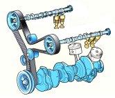 Na donjoj lijevoj skici, vidimo bregastu osovinu sa točno određenim pozicijama brjegova za svaki pojedini ventil motora. A na desnoj, povezanost bregastih osovina zupčastim remenom sa radilicom motora.