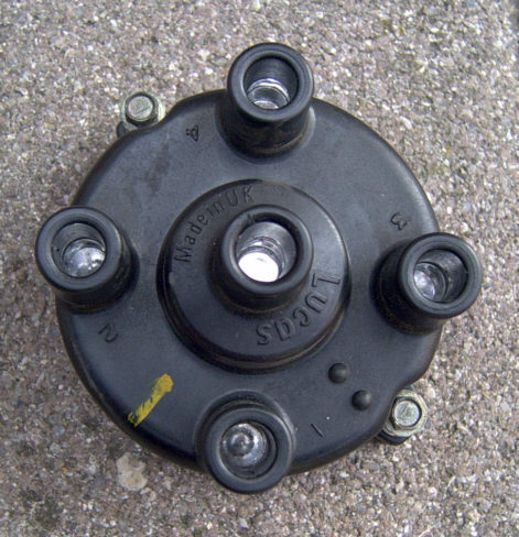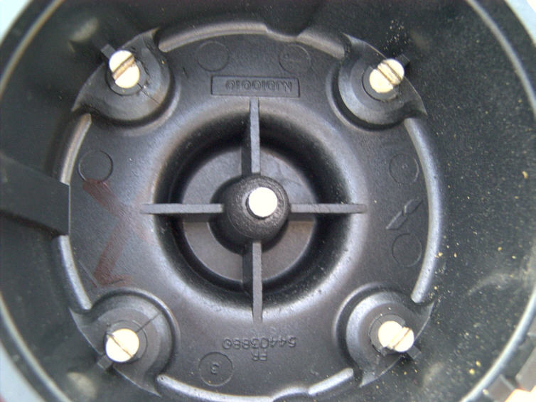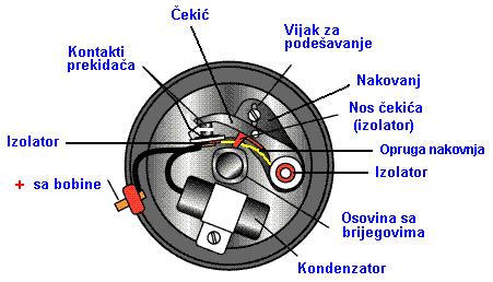 Ovaj shematski prikaz, objašnjava nastanak iskre i njezinu raspodjelu po cilindrima motora. U ovom slučaju, radi se o motoru sa četiri cilindra. Sa pozitivnog terminala akumulatora, struja teče preko kontakt brave na pozitivni terminal (+) indukcijskog kalema (bobine). Sa negativnog terminala bobine, struja teče preko platinskog prekidača na negativni terminal (-) akumulatora. Minus terminal akumulatora, spojen je direktno na karoseriju automobila i sam motor. To znači, da bilo koji metalni sklop pričvršćen na karoseriju ili motor ima na svom kućištu (-). Tako u praksi, za razliku od ove sheme, ne postoji minus žica već je samo kućište razvodnika minus. Tako će kondenzator umjesto žicom, kao što je to prikazano na skici, biti spojen na minus samim tim što je mehanički pričvršćen na kućište razvodnika. Isto se odnosi i na platinski prekidač i svjećice. Ovako spojen negativni terminal, popularno se naziva "masa". Na skici vidimo osovinu razvodnika sa četiri brijega. Svaki brijeg, u točno određenom trenutku, podignuti će kontakt sa čekića platina i odvojiti ga od nakovnja za kojega smo rekli da je čvrsto fiksiran za razvodnik (-). Ova pozicija je prikazana na skici. Za vrijeme otvorenosti platina (uobičajeni termin za platinski prekidač), prekinuti će se strujni krug a u bobini će se inducirati visoki napon. Ovaj inducirani napon, teži za pražnjenjem. Pražnjenje će uslijediti između pozitivne i negativne elektrode svjećice. U svojoj težnji za pražnjenjem, visoki napon bi se mogao djelomično isprazniti iskrenjem preko otvorenih kontakata na platinama. Upravo u tu svrhu, na pozivni terminal platina (čekić) paralelno je spojen kondenzator. Kondenzator će apsorbirati napon pri pokušaju pražnjenja preko kontakata. Tako će jedini način pražnjenja biti moguć preko elektroda svjećica, gdje će se isprazniti i apsorbirani napon iz kondenzatora. Kako iskra dolazi do svjećica? Sada kada znamo kako dolazi do stvaranja visokog napona u bobini, potrebno je razjasniti distribuciju iskre na svjećice svakog pojedinog cilindra motora. Inducirani visoki napon, teče visokonaponskim kabelom od bobine ka razvodnoj kapi na razvodniku, i to na njezin centralni terminal. Sa unutarnje strane toga terminala, napon prelazi preko grafitnog vodiča na na rotor (razvodnu ruku) razvodnika. Grafitni vodič, potisnut oprugom na rotor, omogućiti će konstantan spoj između kape i rotora za vrijeme rada motora u kojem se slučaju rotor okreće a razvodna kapa miruje. Ovim načinom, osigurali smo protok visokog napona sa bobine preko kape na rotor. Na gornjoj lijevoj fotografiji, vidimo kapu sa njene vanjske strane i na njoj centralni terminal za visokonaponski kabel bobine. Na srednjoj fotografiji, vidimo prikaz kape sa njene unutarnje strane. Tu je prikazan grafitni vodič centralnog terminala ispod kojeg je opruga. Opruga će potiskivati vodič na središnji gornji dio kontakta na rotoru (desna slika) Rotor je svojim donjim dijelom nataknut na osovinu razvodnika sa kojom se okreče. Rotor je nataknut na osovinu razvodnika u određenoj poziciji, koju osigurava zub u rotoru i urez na osovini razvodnika. Ova pozicija, određena je tako, da je nos rotora paralelan sa jednim brijegom osovine razvodnika. Ovaj brijeg, obično upotrebljavamo za otvaranje platina (iskra) na prvom cilindru motora. Sada kada znamo da se rotor okreče a kapa miruje te da smo doveli visoki napon na centralni dio rotora, možemo priječi na slijedeću fazu, dovođenje iskre do svjećice. Kapa, koja je nataknuta na razvodnik paljenja, također ima svoju određenu poziciju koja je osigurana zubom na okviru kape i utorom na kućištu razvodnika. Kada smo već uzeli za primjer dovođenja iskre na prvi cilindar motora, možemo i nastaviti tim redom. Znači, u momentu zapaljenja smjese, odnosno pojave iskre na svjećici, brijeg osovine, otvorio je je platine i dolazi do indukcije visokog napona u bobini. Visoki napon, doveli smo od bobine preko razvodne kape do rotora. Nos rotora, u tome momentu, biti će okrenut prema fiksnom kontaktu (elektrodi) terminala prvoga cilindra unutar kape. Na prvoj slici razvodne kape, možemo vidjeti oznake terminala od 1 do 4. Ovi brojevi označavaju cilindre motora sa kojima su povezane njihove svjećice visoko naponskim kablovima. Rotor koji je sa unutarnje strane kape usmjeren prema kontaktu terminala prvog cilindra, nije fizički sa njim spojen. Između nosa rotora i kontakta terminala, postoji mali razmak, kako ne bi došlo do oštećenja istih prilikom vrtnje rotora. No, visoki će napon preskočiti taj razmak sa tendencijom pražnjenja između elektroda na svjećici. Ovom zadnjom fazom dovođenja visokog napona do svjećice, omogućili smo pojavu iskre između pozitivne i negativne elektrode svjećice i zapalili stlačenu smjesu goriva i zraka u cilindru motora. Distribucija iskre na ostale cilindre motora, teći će slijedećim redom. Pogledajmo još jedan puta gornje fotografije. Zamislimo rotor unutar kape na prvoj fotografiji. Rotor će se okretati u strelicom označenom smjeru. Slijedeći terminal na kapi označen je brojkom 3, znači treći cilindar. Kada se u svojoj vrtnji, nos rotora poravna sa kontaktom terminala 3, brijeg koji je paralelan sa nosom rotora, otvoriti će platine. Znači, inducirani napon - iskra. I tako redom, ciklus za ciklusom.